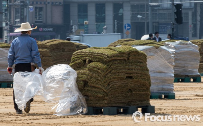 (서울=포커스뉴스) 22일 오후 서울시청 광장에 새봄맞이를 위한 잔디가 쌓여 있다.