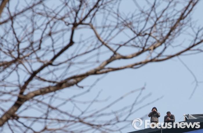 (서울=포커스뉴스) 22일 오전 서울광장 맞은편 구 인권위원회 건물 옥상 광고탑에서 기아차 사내하청 비정규직 노동자 한규협 최정명씨가 고공농성을 284일째 이어가고 있다.
