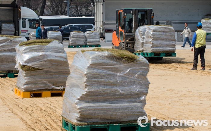 (서울=포커스뉴스) 22일 오후 서울시청 광장에 새봄맞이를 위한 잔디가 쌓여 있다.