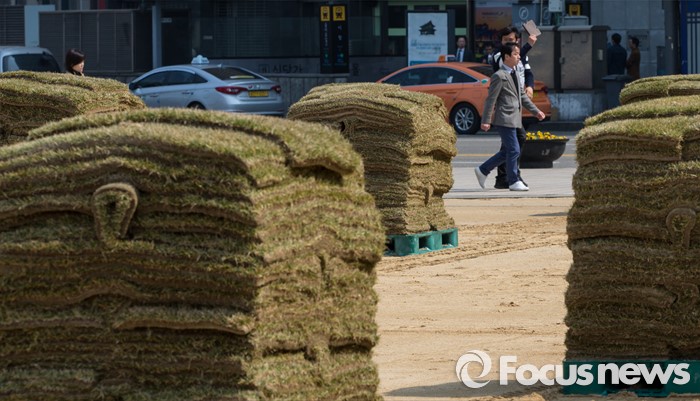 (서울=포커스뉴스) 22일 오후 서울시청 광장에 새봄맞이를 위한 잔디가 쌓여 있다.