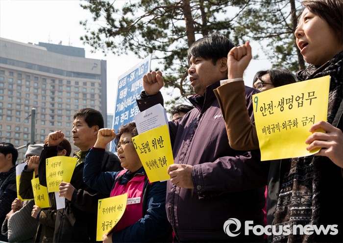 (서울=포커스뉴스) 22일 오전 서울시청 인근에서 열린 2016 비정규직 총선연대 발족식에 참석한 비정규직 노동자들이 정규직 전환, 파견법 폐지 등 요구사항이 적힌 손팻말을 들고 있다.