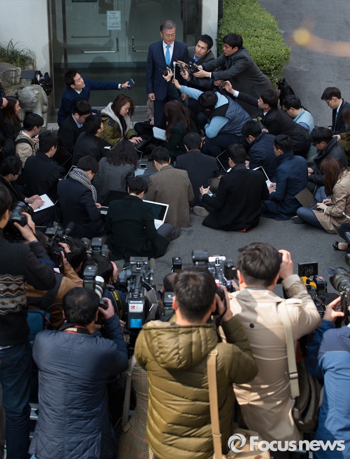 (서울=포커스뉴스) 문재인 더불어민주당 전 대표가 22일 오후 서울 종로구 구기동의 김종인 비상대책위원회 대표와 면담 후 김 대표 자택을 나서며 취재진 질문에 답하고 있다.