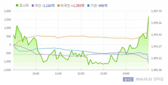 이날 코스피는 전일대비 0.18% 오른 1993.37로 장을 시작했다. 그러나 지수는 개인과 기관의 동반 팔자에 하락세로 전환했다. 장 중반 외국인이 대규모 매수에 나서면서 결국 연고점을 경신했다.