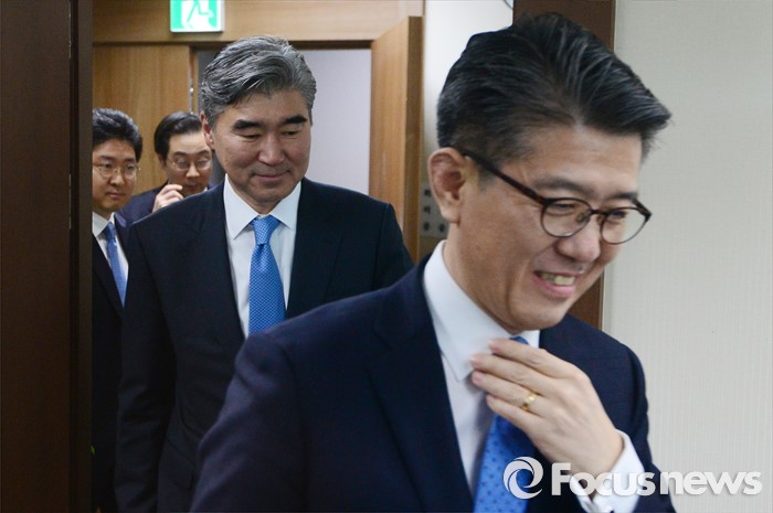 (서울=포커스뉴스) 성김 국무부 대북정책특별대표와 김홍균 한반도평화교섭본부장이 22일 서울 종로구 외교부에서 열린 '한·미 북핵 6자회담'에 참석해 자리로 향하고 있다.