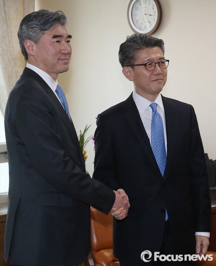 (서울=포커스뉴스) 성김(왼쪽) 국무부 대북정책특별대표와 김홍균 한반도평화교섭본부장이 22일 서울 종로구 외교부에서 열린 '한·미 북핵 6자회담'에 참석해 인사를 나누고 있다.