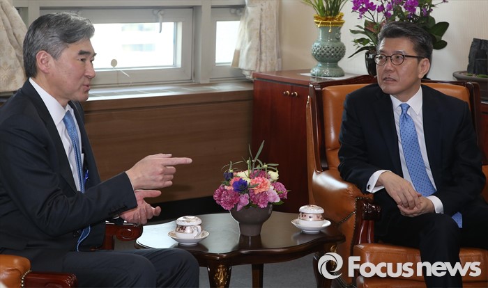 (서울=포커스뉴스) 성김(왼쪽) 국무부 대북정책특별대표와 김홍균 한반도평화교섭본부장이 22일 서울 종로구 외교부에서 열린 '한·미 북핵 6자회담'에 참석해 대화를 나누고 있다.