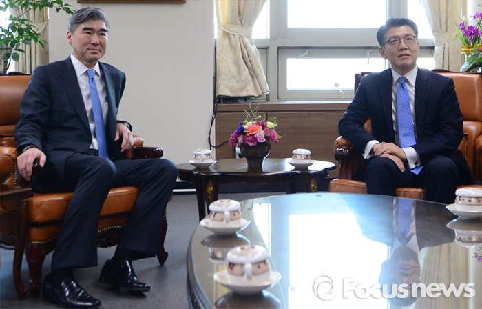 (서울=포커스뉴스) 성김(왼쪽) 국무부 대북정책특별대표와 김홍균 한반도평화교섭본부장이 22일 서울 종로구 외교부에서 열린 '한·미 북핵 6자회담'에 참석해 대화를 나누고 있다.