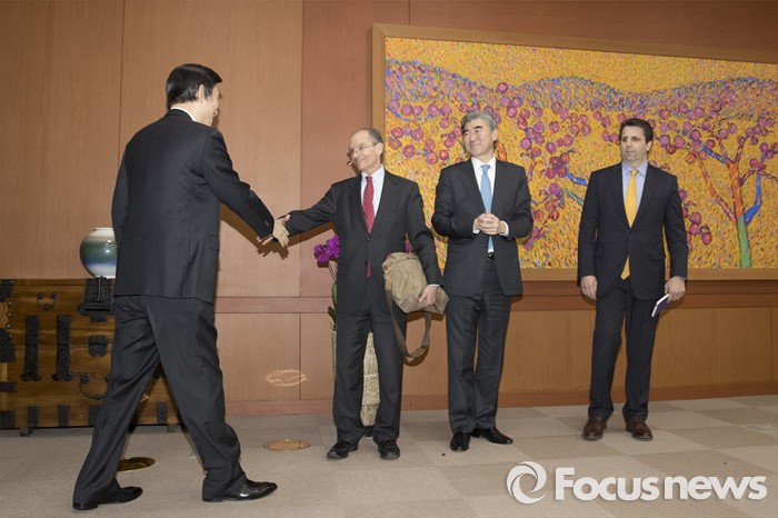 (서울=포커스뉴스) 윤병세 외교부 장관이 22일 오후 서울 종로구 외교부에서 대니얼 프리드 미 국무부 제재정책조정관, 성김 미 국무부 대북정책특별대표, 마크 리퍼트 주한미국대사와 만나 인사를 나누고 있다.