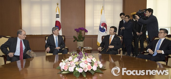 (서울=포커스뉴스)대니얼 프리드(왼쪽부터) 미 국무부 제재정책조정관, 성김 미 국무부 대북정책특별대표, 윤병세 외교부 장관, 김홍균 한반도평화교섭본부장이 22일 오후 정부서울청사 별관 외교부에서 만나 대화를 나누고 있다.