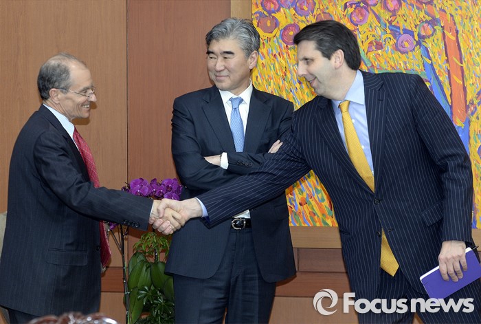 (서울=포커스뉴스)대니얼 프리드(왼쪽) 제재정책조정관이 22일 오후 서울 종로구 외교부 청사에서 마크 리퍼트(오른쪽) 주한미국 대사, 성김 미 대북정책 특별대표와 윤병세 외교부 장관과 접견에 앞서 인사를 하고 있다.