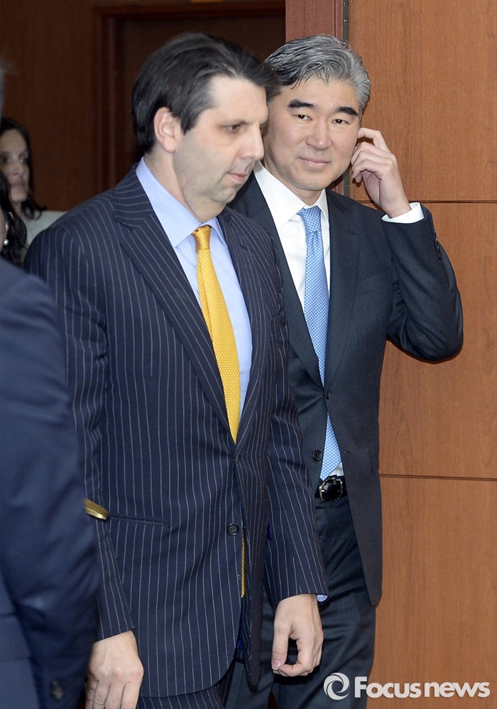 (서울=포커스뉴스)22일 오후 서울 종로구 외교부 청사애서 성김(오른쪽) 미 대북정책 특별대표, 마크 리퍼트 주한미국 대사가 윤병세 외교부 장관과 접견을 위해 이동하고 있다.