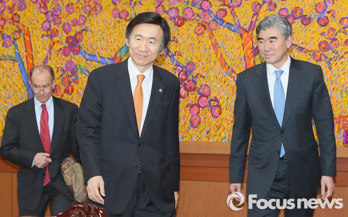 (서울=포커스뉴스) 윤병세 외교부 장관이 22일 오후 서울 종로구 외교부에서 대니얼 프리드 미 국무부 제재정책조정관, 성김 미 국무부 대북정책특별대표와 함께 자리로 향하고 있다.