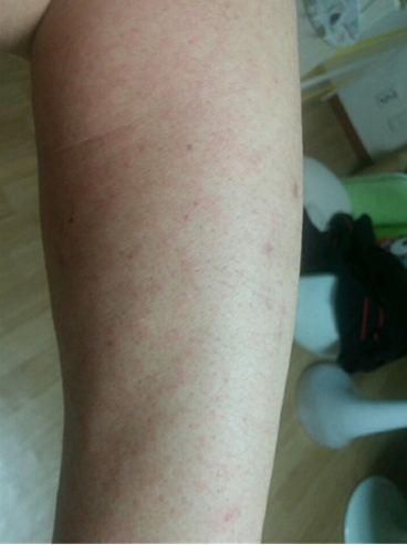 (서울=포커스뉴스)22일 질병관리본부가 공개한 지카바이러스 양성 판정을 받은 L(43)씨의 지난 21일 발진 사진. 질병관리본부는 현재 L씨는 발열이 없고 발진이 가라앉아 호전 중이라고 밝혔다. <사진제공=질병관리본부>
