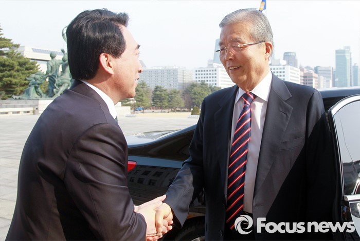 | △ 마중 나온 박수현 비서실장과 악수하는 김종인 대표 |