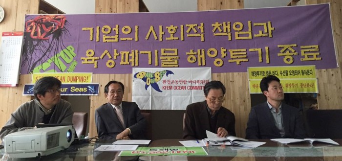 당초 이명박 정부는 2014년부터 모든 폐기물의 해양투기를 원천 금지하기로 했지만 박근혜 정부는 산업폐수에 한해 2년간 해양투기를 허용했다.환경단체들이 22일 서울 종로구 환경보건시민센터에서 기자회견을 열고 '폐기물 해양투기현황 및 오염실태 종합보고서'를 발표하고 있다. 왼쪽부터 최예용 환경보건시민센터 소장, 윤준하 환경운동연합 바다위원회 공동위원장, 고철환 공동위원장, 류종성 안양대 해양생명공학과 교수. 박지선 기자