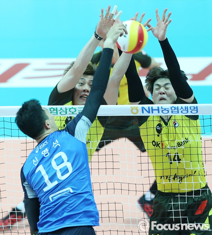 (안산=포커스뉴스) 22일 안산상록수체육관에서 열린 2015-2016 V-리그 남자부 챔피언결정전 3차전 OK저축은행-현대캐피탈 경기에서 OK저축은행 박원빈과 송희채가 현대캐피탈 신영석의 스파이크를 블로킹으로 막고 있다.