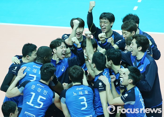 (안산=포커스뉴스) 22일 안산상록수체육관에서 열린 2015-2016 V-리그 남자부 챔피언결정전 3차전에서 OK저축은행에 승리해 2패 후 1승을 올린 현대캐피탈 선수들이 환호하며 기뻐하고 있다.