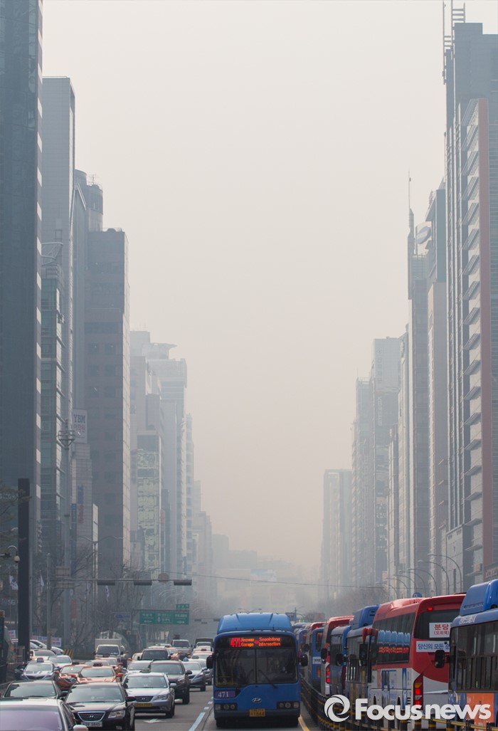 (서울=포커스뉴스) 23일 오전 서울 강남대로가 미세먼지로 뿌연 모습을 보이고 있다. 기상청은 미세먼지 농도가 수도권에서 아침 한때 '나쁨'이 되겠지만 곧 '보통' 수준으로 회복될 것을 예상했다.