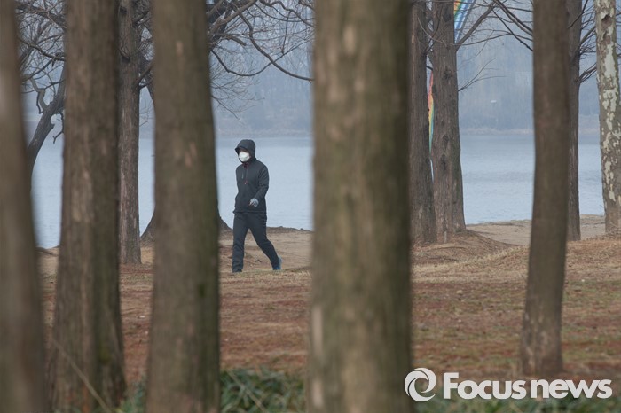 (고양=포커스뉴스) 꽃샘추위가 다시 시작된 23일 오전 경기도 고양시 일산 호수공원에서 한 시민이 운동을 하고 있다. 미세먼지는 수도권에서 아침 한때 '나쁨'이 되겠지만 곧 '보통' 수준으로 회복될 것을 예상한다.