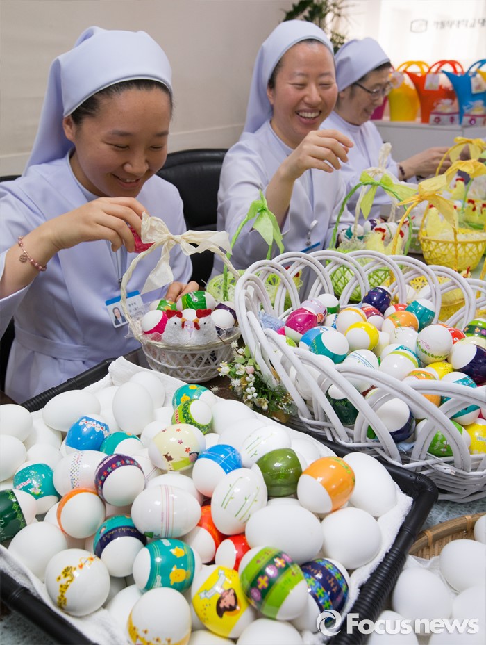 (대전=포커스뉴스) 부활절을 앞두고 23일 오전 대전 중구 가톨릭대학교 대전성모병원 원목팀 수녀들이 정성스럽게 꾸민 달걀을 바구니에 담고 있다. 이날 가톨릭대학교 대전성모병원 직원들은 생명의 탄생을 의미하는 부활 달걀 총 3000여개를 병동의 환자 및 보호자, 지역주민들에게 전달했다.