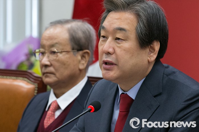 (서울=포커스뉴스) 김무성(오른쪽) 새누리당 대표가 23일 오전 서울 여의도 국회에서 열린 최고위원회의에 참석해 모두발언하는 동안, 강봉균(왼쪽) 공동선대위원장이 경청하고 있다.