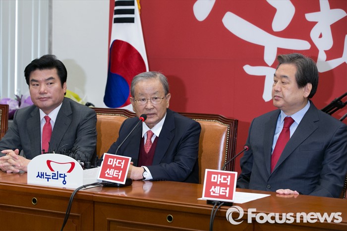 (서울=포커스뉴스) 강봉균(가운데) 새누리당 공동선대위원장이 23일 오전 서울 여의도 국회에서 열린 최고위원회의에 참석해, 발언하는 동안, 김무성(오른쪽) 대표, 원유철 원내대표가 경청하고 있다.
