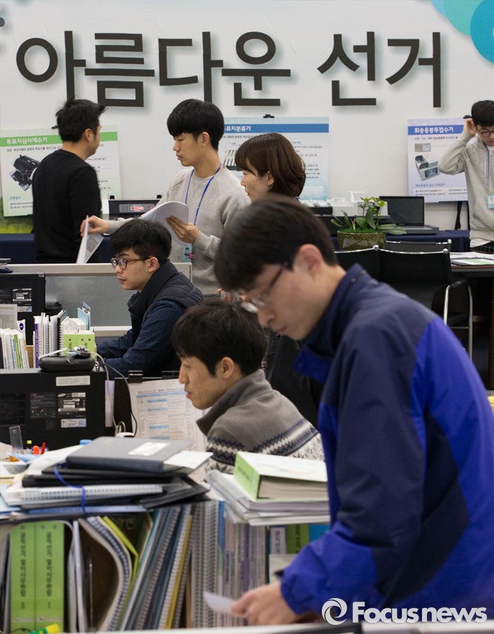(과천=포커스뉴스) 20대 총선 후보자 등록을 하루 앞둔 23일 오전 경기도 정부 과천 청사 선거 상황실에서 근무자들이 업무에 열중하고 있다.