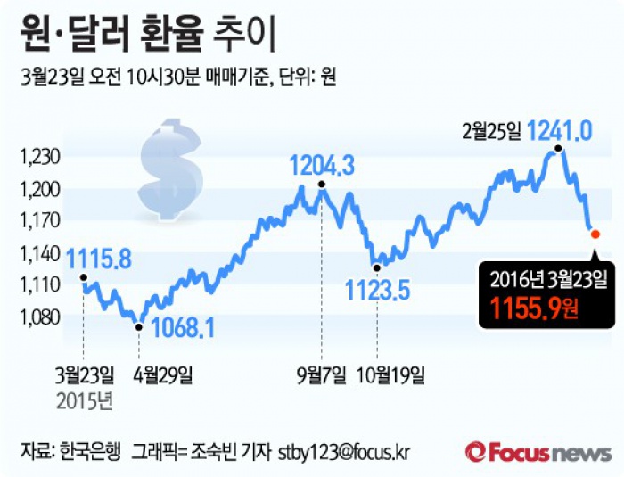 원화 가치는 2016년 첫 8주 동안 미국 달러화 대비 5.4% 절하되다가 이후 4주간은 6.6% 절상되는 양상을 보였다. 첫 8주간의 절하폭은 아르헨티나 페소화 가치에 절하폭인 16.0%에 이어 두 번째로 높은 수준이며, 이후 4주 간의 절상폭은 러시아 루블화(10.4%), 브라질 헤알화(9.2%)에 버금가는 수준이다.