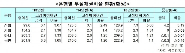 2015년말 은행권의 부실채권 비율은 1.80%로 2010년말 1.90%이후 가장 높은 수준에 이르고 있다. 대출 연체율도 상승세라 안심할 수 없는 상황이다. 금감원이 최근 낸 올 1월말 국내은행의 원화대출 연체율은 0.67%로 전월말 0.58%와 비교해 0.09%포인트 상승했다.