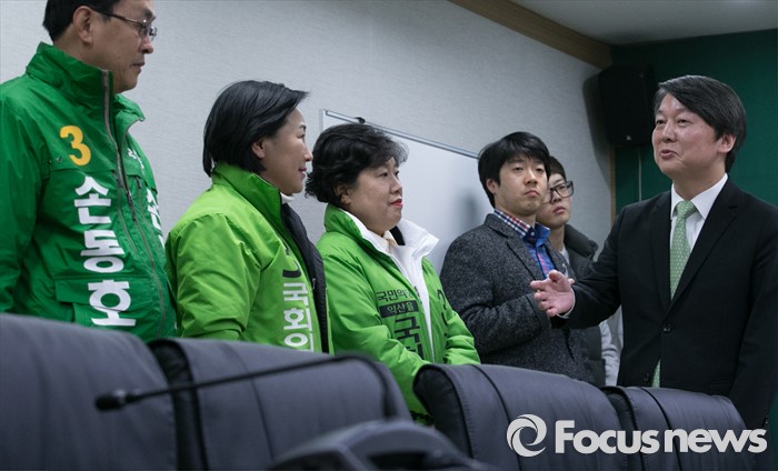 (서울=포커스뉴스) 안철수 국민의당 상임공동대표가 23일 오전 서울 마포구 당사에서 열린 20대 총선 공천장 수여식에 참석해 후보자들과 대화하고 있다. 국민의당은 이날 국회 본청에서 공천장 수여식 행사를 진행하려고 했지만, 공천에서 탈락한 김승남 의원 등 지지자들의 여론조사 관련 항의에 급하게 장소를 옮겨 진행했다.