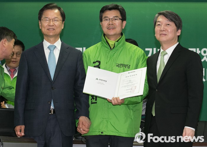(서울=포커스뉴스) 안철수(오른쪽) 국민의당 상임공동대표와 천정배(왼쪽) 공동대표가 23일 오전 서울 마포구 당사에서 열린 20대 총선 공천장 수여식에 참석해 장환진(서울 동작갑) 예비후보에게 공천장을 수여하고 있다. 국민의당은 이날 국회 본청에서 공천장 수여식 행사를 진행하려고 했지만, 공천에서 탈락한 김승남 의원 등 지지자들의 여론조사 관련 항의에 급하게 장소를 옮겨 진행했다.