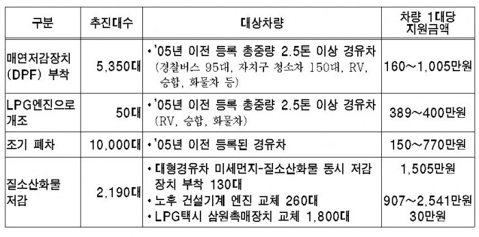 또 2005년 이전에 등록된 경유차 1만대를 대상으로 조기폐차비용도 지원한다. 지원금은 보험개발원에서 산정한 차량 기준가액의 85~100%이다. 저소득층은 여기에 10%를 더 지원받을 수 있다.