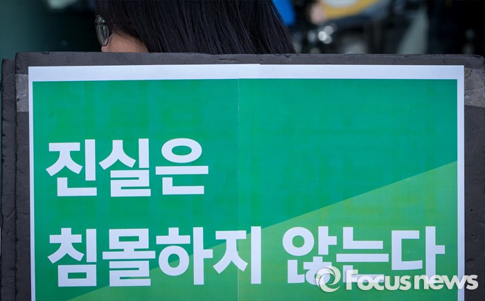 (서울=포커스뉴스) 23일 오후 서울행정법원 앞에서 열린 '청와대 상대 정보공개 소송 결과' 관련 기자회견에 참석한 녹색당원이 '진실은 침몰하지 않는다'라는 문구가 적힌 손팻말을 들고 있다.