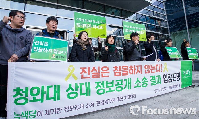 (서울=포커스뉴스) 23일 오후 서울행정법원 앞에서 열린 '청와대 상대 정보공개 소송 결과' 관련 기자회견에 참석한 하승수, 이유진 녹색당 공동운영위원장 및 당원들이 구호를 외치고 있다.