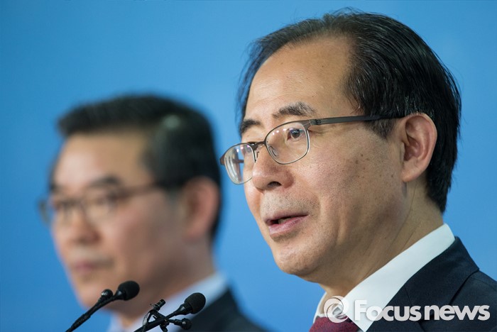 (서울=포커스뉴스) 20대 총선 서울 강남갑 험지로 전략 공천된 김성곤(오른쪽) 더불어민주당 의원이 23일 오후 서울 여의도 국회 정론관에서 김성욱 전 지역위원장과 함께 기자회견을 하고 있다.