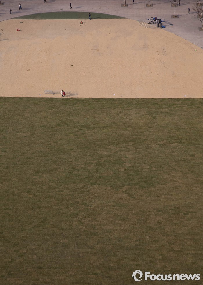 (서울=포커스뉴스) 서울시가 겨울 동안 스케이트장으로 사용됐던 서울광장에 23일 오후 잔디를 새롭게 단장하고 있다