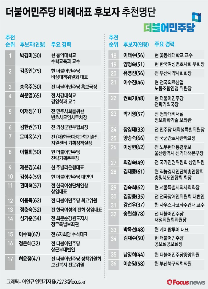 (서울=포커스뉴스) 더불어민주당이 23일 오는 20대 총선에 나설 비례대표 후보자 36명을 발표했다.