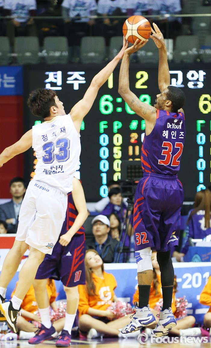(고양=포커스뉴스) 23일 고양체육관에서 열린 2015-2016 프로농구 챔피언결정전 3차전 오리온-KCC경기에서 KCC 정희재가 오리온 헤인즈의 점프슛때 슛블록으로 저지하고 있다.