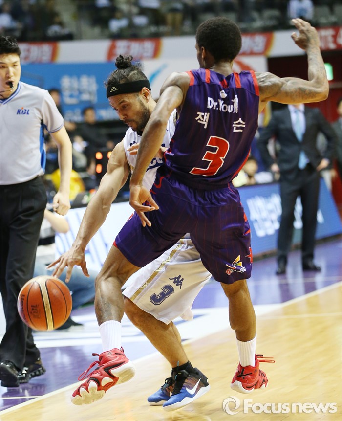 (고양=포커스뉴스) 23일 고양체육관에서 열린 2015-2016 프로농구 챔피언결정전 3차전 오리온-KCC경기에서 KCC 전태풍이 오리온 조 잭슨의 마크를 밀어내며 돌파를 시도하고 있다.