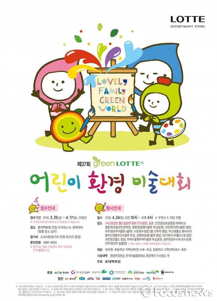 이완신 롯데백화점 마케팅부문장은 “그린롯데 어린이 환경미술대회는 롯데백화점 창사 이래 37년째 개최하고 있는 행사로 국내 최대 환경 미술대회”라며 “따뜻한 봄을 맞아 가족들과 의미 있는 시간을 보내고 좋은 추억을 만들었으면 좋겠다”고 말했다.롯데백화점은 4월24일 제37회 그린롯데 어린이 환경 미술대회를 개최한다. 3월25일부터 4월17일까지 참가 접수를 받는다.<사진제공=롯데백화점>