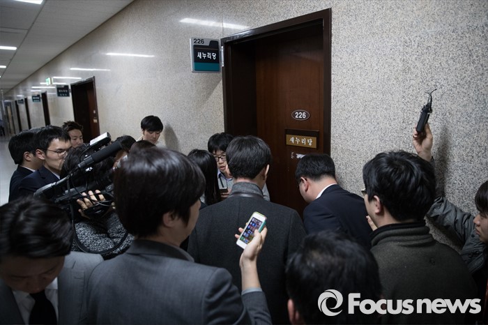 (서울=포커스뉴스) 23일 오후 서울 여의도 국회에서 열린 새누리당 최고위원회의장에서 고성이 들리자 취재진들이 출입문에 붙어 소리를 듣고 있다.