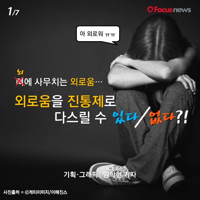 (서울=포커스뉴스) 그룹 엑소-케이(EXO-K)의 곡 'MAMA'의 가사에는 이런 내용이 있습니다. '날이 갈수록 외로움만 더해져 / 우리가 인간일 수 밖에 없는 건 / 상처 받는 것.' 인생을 살면서 외로움이라는 감정에서 자유롭기란 쉬운 일이 아니죠. 그런데 그 외로움을 진통제로 다스릴 수 있다는 연구 결과가 있습니다. 자세한 내용을 카드뉴스로 알아보시죠.