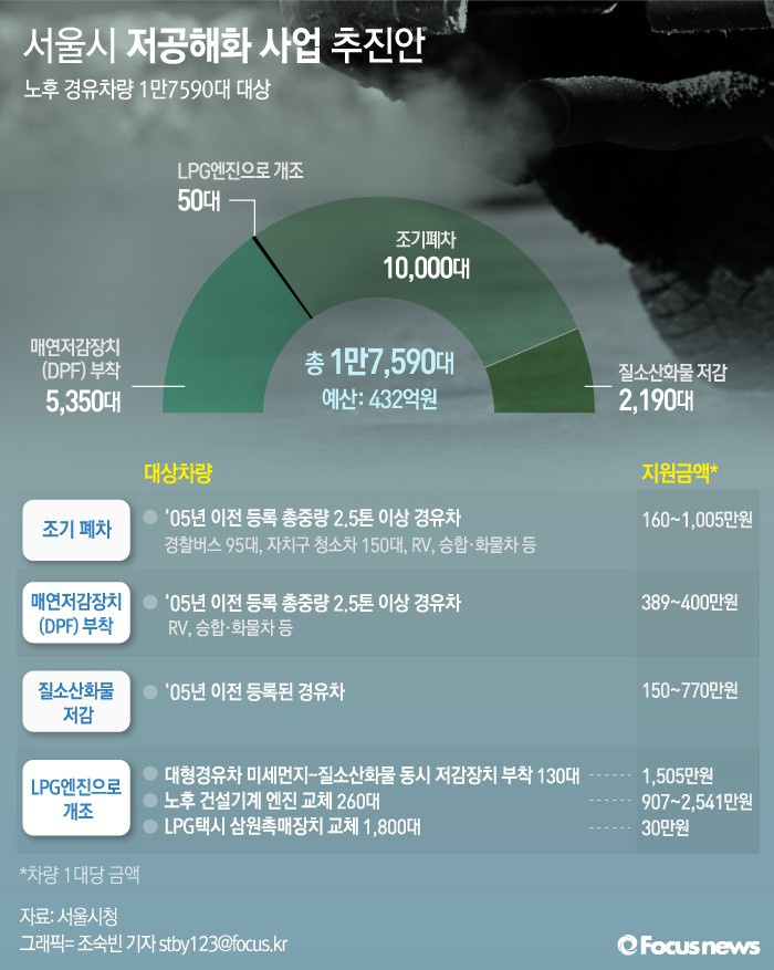 (서울=포커스뉴스) 서울시는 대기질 개선을 위해 노후 경유차량 1만7590대에 저공해화 사업을 추진한다고 23일 밝혔다.