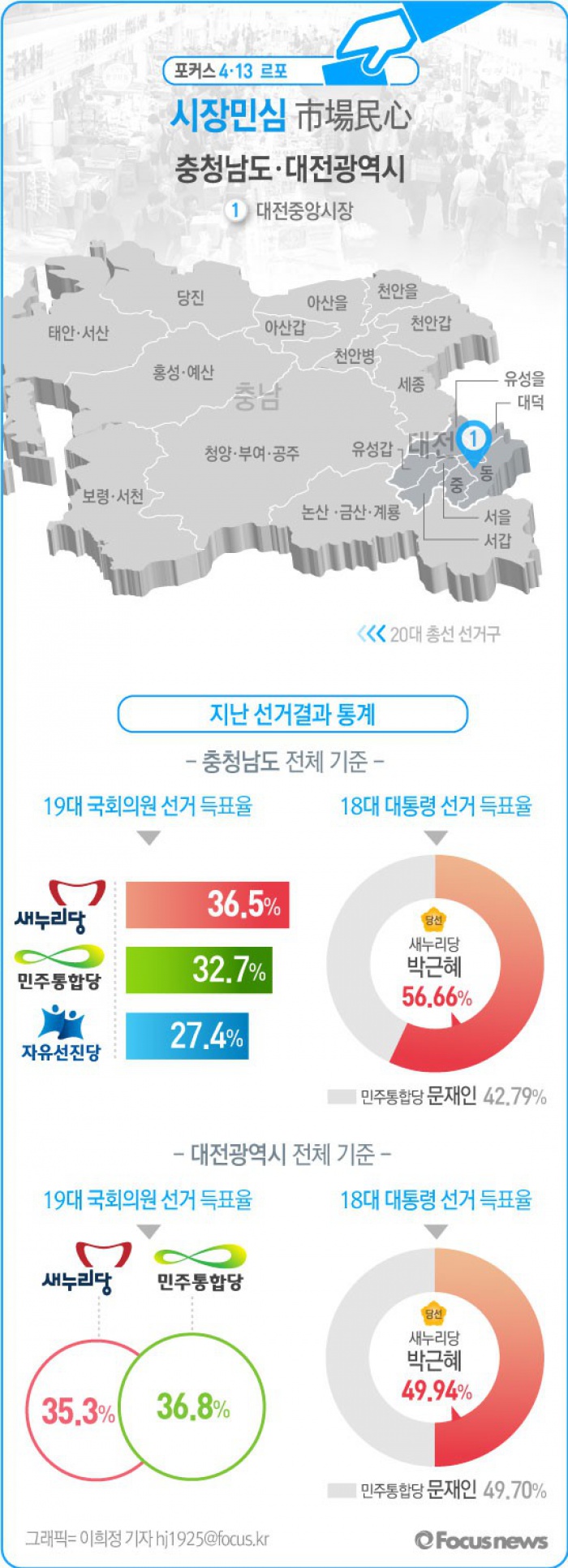 (서울=포커스뉴스) 충청도는 대한민국 총선·대선을 가릴 것 없이 수도권과 함께 '캐스팅 보트'로 여겨진다. 영남과 호남이 각자 정치색이 뚜렷한 반면, 충청도는 지역 정당이 없고 여야가 번갈아가며 집권한 까닭에 선거 판세를 결정짓는 지역으로 꼽힌다. 19대 총선에서는 새누리당과 더불어민주당(당시 민주통합당)이 대전 지역구 6개를 사이좋게 3개씩 나눠가졌다.