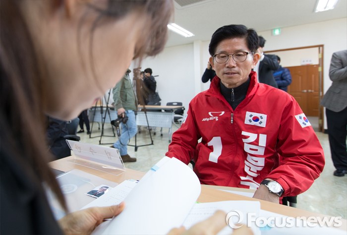 (대구=포커스뉴스) 24일 오전 대구 수성구 선거관리위원회에서 김문수 새누리당 전 의원이 20대 총선 국회의원 후보 등록을 하고 있다.