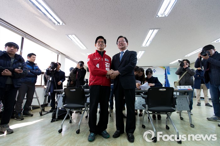 (대구=포커스뉴스) 24일 오전 대구 수성구 선거관리위원회에서 김문수(왼쪽) 새누리당 전 의원과 김부겸 더불어민주당 전 의원이 20대 총선 국회의원 후보 등록 후 기념촬영을 하고 있다.