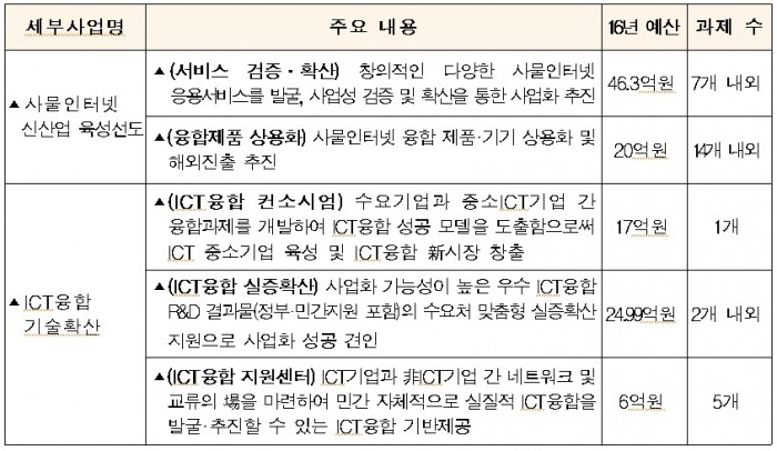 사업의 공모안내서는 정보통신산업진흥원(www.nipa.kr) 홈페이지에서 확인할 수 있다.미래부의 사물인터넷 육성사업 세부내용.<표제공=미래부>