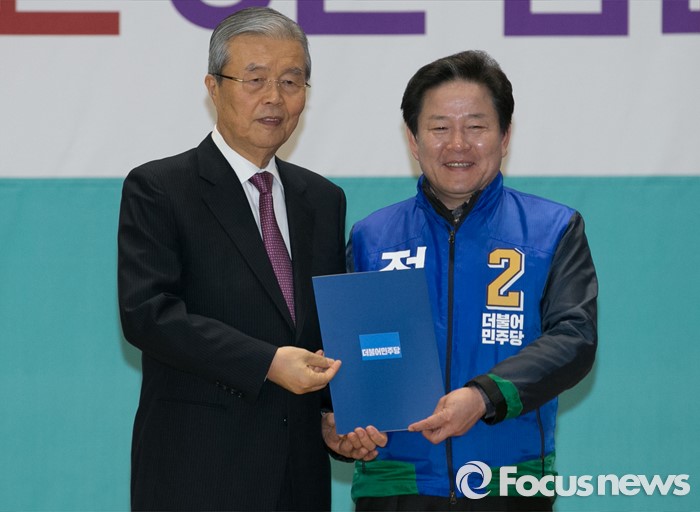 (서울=포커스뉴스) 김종인(왼쪽) 더불어민주당 비대위 대표가 24일 오전 서울 여의도 국회에서 공천장 수여식에 참석해 정재호 경기 고양을 후보에게 공천장을 전달한 뒤 기념촬영을 하고 있다.