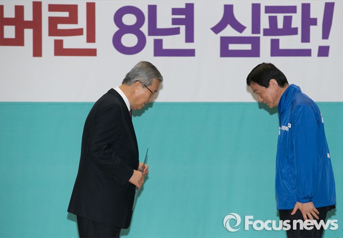 (서울=포커스뉴스) 김종인(왼쪽) 더불어민주당 비대위 대표가 24일 오전 서울 여의도 국회에서 공천장 수여식에 참석해 진영 의원(서울 용산)에게 공천장 전달에 앞서 인사하고 있다.
