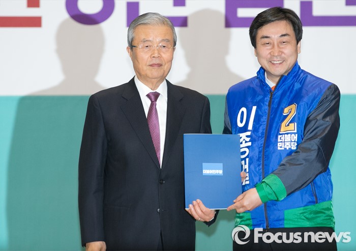 (서울=포커스뉴스) 김종인(왼쪽) 더불어민주당 비대위 대표가 24일 오전 서울 여의도 국회에서 공천장 수여식에 참석해 이종걸 원내대표에게 공천장을 전달한 뒤 포즈를 취하고 있다.